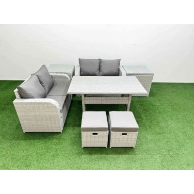 6 Seater Outdoor Love Sofa Set Rattan Garden Furniture with Rectangular Dining Table 2 Small Stools Side Tables Light Grey Fimous