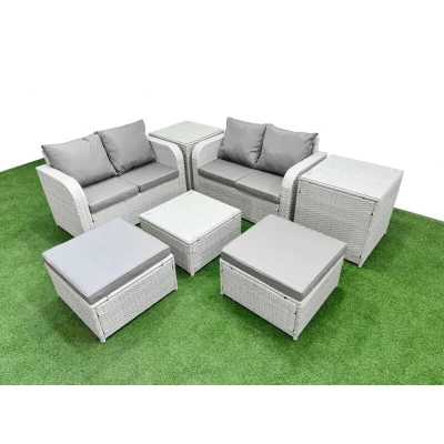 6 Seater Outdoor Love Sofa Set Rattan Garden Furniture with Square Coffee Table 2 Footstool Side Tables Light Grey Fimous
