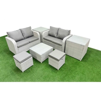 6 Seater Outdoor Love Sofa Set Rattan Garden Furniture with Square Coffee Table 2 Small Stools Side Tables Light Grey Fimous