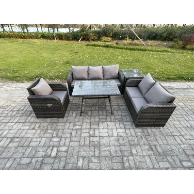 General description This 5-piece deluxe garden furniture set enhances the beauty of your courtyard, deck, backyard, porch, or swimming pool. Made from high-quality PE rattan and durable galvanized steel construction, it is designed to withstand adverse weather conditions. The set can be easily rearranged into different configurations to suit your needs. Technical specifications 1 x Side coffee table: 65L x 65W x 66H cm 1 x Reclining Chair: 74W x 67D x 79H cm 1 x Love Sofa: 124W x 67D x 79H cm 1 x 3 Seater Sofa: 177W x 67D x 79H cm 1 x Rectangular Dining Table: 110L x 70W x 70H cm Color: Dark grey mixed rattan with dark grey fabric Seat cushion thickness: 8 cm Installation Items come flat packed and are easy to assemble. Includes sturdy galvanized steel tube metal frames with powder coating to prevent rust. Usage The reclining chairs are adjustable, allowing you to change the backrest inclination from 90° to 130°. Removable cushion covers for easy maintenance. It is recommended to keep