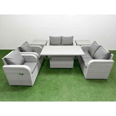 6 Seater Outdoor Reclining Chair Love Sofa Set Rattan Garden Furniture with Adjustable Lifting Dining or Coffee Table 2 Side Tables Light Grey