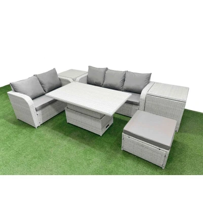 General description This deluxe garden furniture set enhances the aesthetic of your courtyard, deck, backyard, porch, or swimming pool. Constructed from high-quality PE rattan and durable galvanized steel, it is designed to withstand adverse weather conditions in the UK. The set can be easily configured into different arrangements to suit your needs. Technical specifications 1 x Love Sofa Size: 124W x 67D x 79H cm 1 x 3 Seater Sofa Size: 177W x 67D x 79H cm 2 x Side Table Size: 65L x 65W x 66H cm 1 x Big Footstool Size: 65L x 65W x 34H cm 1 x Lifting Table Size: 140L x 80W x 68/48H cm (height adjustable: up 68 cm, down 48 cm) 8 cm thick seat cushion with soft pillow back cushion Installation Items come flat packed and are easy to assemble. Sturdy galvanized steel tube metal frames with powder coating to prevent rust. Usage Low maintenance required. Removable cushion covers for easy cleaning. Keep cushions indoors or use a rain cover when not in use. Use a rain cover if the furniture