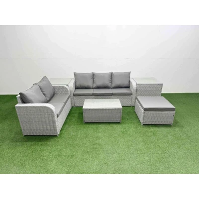 General description This deluxe garden furniture set enhances the decor of your courtyard, deck, backyard, porch, and swimming pool. Made from high-quality PE rattan and durable galvanized steel, it is designed to withstand adverse weather conditions in the UK. The set can be easily reconfigured to suit your needs at any time. Technical specifications 1 x Love Sofa Size: 124W x 67D x 79H cm 1 x 3 Seater Sofa Size: 177W x 67D x 79H cm 2 x Side Table Size: 65L x 65W x 66H cm 1 x Big Footstool Size: 65L x 65W x 34H cm 1 x Oblong Coffee Table Size: 85L x 50W x 37H cm Material: Light grey PE rattan with dark grey fabric Seat Cushion Thickness: 8 cm Tempered Glass Thickness: 5 mm Installation Items come flat packed and are easy to assemble. The furniture features sturdy galvanized steel tube frames with powder coating to prevent rust. Usage Low maintenance is required, with removable cushion covers for easy cleaning. It is recommended to keep the cushions indoors or covered with a rain