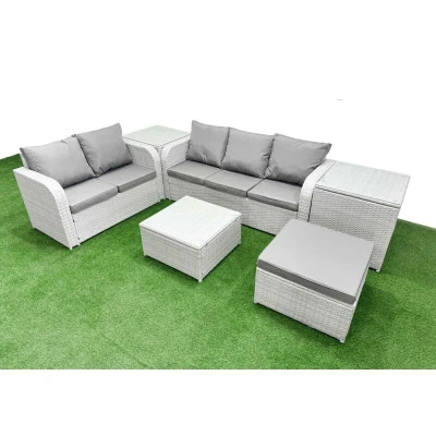 General description This deluxe Garden furniture set enhances the decor of your courtyard, deck, backyard, porch, and swimming pool. It is constructed from high-quality PE rattan and durable galvanized steel, designed to withstand adverse weather conditions. The set can be easily reconfigured to suit your needs at any time. Technical specifications 1 x Love Sofa Size: 124W x 67D x 79H cm 1 x 3 Seater Sofa Size: 177W x 67D x 79H cm 2 x Side Table Size: 65L x 65W x 66H cm 1 x Big Footstool Size: 65L x 65W x 34H cm 1 x Square Coffee Table Size: 65L x 65W x 34H cm Seat Cushion Thickness: 8 cm Material: Light grey PE rattan with dark grey fabric Glass Thickness: 5 mm tempered glass Installation Items come flat packed and are easy to assemble. Usage Keep the cushions indoors or covered with a rain cover when not in use. Use a rain cover to protect the furniture if not used for an extended period. Other information Removable cushion covers for easy maintenance. Sturdy galvanized steel tube