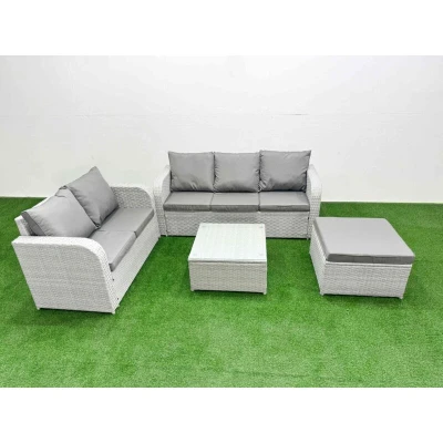 General description This deluxe Garden furniture set enhances the aesthetic of your courtyard, deck, backyard, porch, or swimming pool. Constructed from high-quality PE rattan and durable galvanized steel, it is designed to withstand adverse weather conditions in the UK. The set can be easily reconfigured to suit your needs at any time. Technical specifications 1 x Love Sofa Size: 124W x 67D x 79H cm 1 x 3 Seater Sofa Size: 177W x 67D x 79H cm 1 x Big Footstool Size: 65L x 65W x 34H cm 1 x Square Coffee Table Size: 65L x 65W x 34H cm Material: Light grey PE rattan with dark grey fabric Seat Cushion Thickness: 8 cm Glass Thickness: 5 mm tempered glass Installation Items come flat packed and are easy to assemble. Sturdy galvanized steel tube metal frames with powder coating to prevent rust. Usage Low maintenance with removable cushion covers. Keep cushions indoors or use a rain cover when not in use. Use a rain cover for the furniture if not in use for an extended period. Other