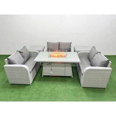 General description This Fimous 6 Seater PE Wicker Rattan Furniture Sofa Set includes a firepit dining table, two 2-seater love sofas, and two side tables, all designed for outdoor comfort and style. The set features a light grey PE rattan finish complemented by dark grey fabric cushions, providing a modern aesthetic for your patio or garden. Technical specifications 3 x Love Sofa Size: 124W x 67D x 79H cm 2 x Side Table Size: 65L x 65W x 66H cm 1 x Firepit Dining Table Size: 140L x 80W x 69H cm Material: Light grey PE rattan with dark grey fabric Seat Cushion Thickness: 8 cm Glass Top: 5 mm thickness transparent tempered glass Installation Items come flat packed and are easy to assemble. Sturdy galvanized steel tube metal frames with powder coating to prevent rust. Usage Place the gas fire pit on the glass top, not under it. Do not cover the igniter with lava rocks. Check for gas leaks at the joints and hose before use. Keep cushions indoors or use a rain cover when not in use. Use a