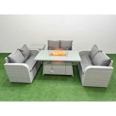 General description This Fimous 6 Seater PE Wicker Rattan Furniture Sofa Set includes a firepit dining table, a 2-seater love sofa, and a side table, all designed for outdoor comfort and style. The set features light grey PE rattan with dark grey fabric cushions, providing a modern aesthetic for your patio or garden. Technical specifications 3 x Love Sofa Size: 124W x 67D x 79H cm 1 x Side Table Size: 65L x 65W x 66H cm 1 x Firepit Dining Table Size: 140L x 80W x 69H cm 8 cm Thick Seat Cushion Material: Light grey PE rattan, dark grey fabric, galvanized steel tube frames with powder coating 5mm Thickness Transparent Tempered Glass Installation Items come flat packed and are easy to assemble. Ensure to check the product carefully before signing for delivery. Usage Place the gas fire pit on the glass top, not under it, and avoid covering the igniter with lava. Check for any gas leakage at the joints or hose before use. Keep cushions indoors or use a rain cover when not in use. Use a 5