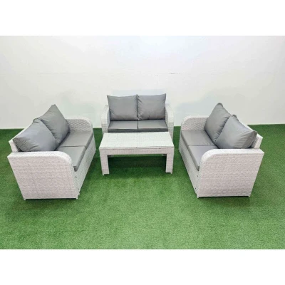General description This deluxe garden furniture set enhances the decor of your courtyard, deck, backyard, porch, or swimming pool. Made from high-quality PE rattan and durable galvanized steel construction, it is designed to withstand adverse weather conditions and can be easily configured to suit your needs. Technical specifications 3 x Love Sofa Size: 124W x 67D x 79H cm 1 x Rectangular Coffee Table Size: 105L x 50W x 48H cm Material: Light grey PE rattan with dark grey fabric Seat Cushion Thickness: 8 cm Tempered Glass Thickness: 5 mm Installation Items come flat packed and are easy to assemble. Includes sturdy galvanized steel tube metal frames with powder coating to prevent rust. Usage Removable cushion covers for easy maintenance. Keep cushions indoors or use a rain cover when not in use. Use a rain cover if the furniture is not used for an extended period. Other information Factory direct sale guarantees quality and after-sale service. If there are any issues with assembly,