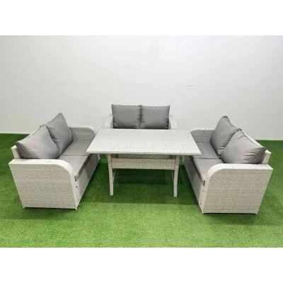 General description This deluxe garden furniture set enhances the decor of your courtyard, deck, backyard, porch, or swimming pool. Made from high-quality PE rattan and durable galvanized steel, it is designed to withstand adverse weather conditions. The set can be easily reconfigured to suit your needs at any time. Technical specifications 3 x Love Sofa Size: 124W x 67D x 79H cm 1 x Dining Table Size: 140L x 80W x 68H cm Material: Light grey PE rattan with dark grey fabric Seat Cushion Thickness: 8 cm Glass Thickness: 5 mm tempered glass Installation Items come flat packed and are easy to assemble. Sturdy galvanized steel tube frames with powder coating to prevent rust. Usage Keep cushions indoors or use a rain cover when not in use. Use a rain cover for the furniture if not in use for an extended period. Other information Removable cushion covers for easy maintenance. For any assembly issues, missing parts, or product quality concerns, contact the after-sales team for assistance