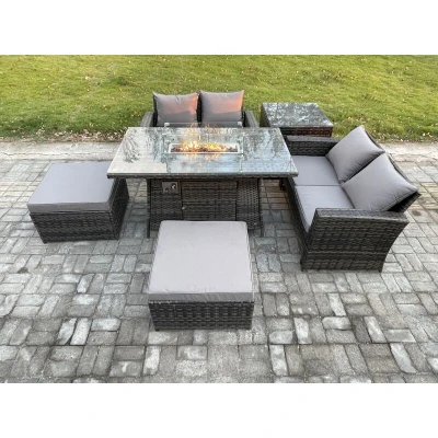 General description This 6-seater deluxe gas fire pit rattan sofa dining set is an excellent addition to your patio or garden. It is constructed from high-quality PE rattan and durable galvanized steel, ensuring sturdiness and structural durability. The set includes a gas fire pit dining table, two 2-seater sofas, two big footstools, and a side coffee table, providing a comfortable and stylish outdoor lounging experience. Technical specifications Side coffee table size: 65L x 65W x 66H cm PC dining table with fire pit size: 140L x 80W x 69H cm Big footstool size: 65L x 65W x 34H cm 2 Seater sofa size: 124L x 70W x 74H cm Seat cushion thickness: 8 cm Material: Dark grey mixed rattan with dark grey fabric Glass top: 5mm thickness transparent tempered glass Installation Set comes flat packed and is easy to assemble. Usage Place the gas fire pit on the glass top, not under it. Do not cover the igniter with lava rocks. Check for any gas leaks at the joints or hose before use. Keep the