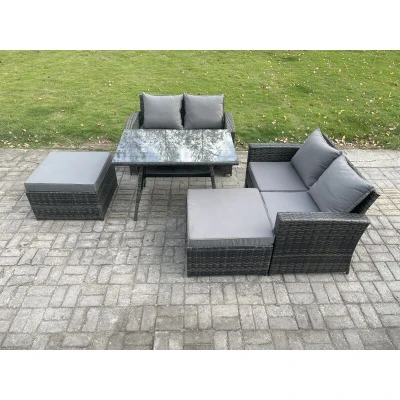 General description This 6-seater deluxe rattan sofa set is an excellent addition to your patio or garden. It is made of high-quality PE rattan and features a durable galvanized steel construction, ensuring sturdiness and longevity. This set is designed for outdoor use all year round. Technical specifications Set Dimensions: 2 x Big footstool: 65L x 65W x 34H cm 2 x 2 Seater sofas: 124L x 70W x 74H cm 1 x Dining table: 110L x 70W x 70H cm 8 cm thick seat cushion with soft pillow back cushion 5 mm thickness clear tempered glass with suckers on the surface to prevent sliding Installation Items come flat-packed; self-assembly is necessary. Usage Low maintenance; removable cushion covers for easy cleaning. Keep cushions indoors or use a rain cover when not in use. Use a furniture cover if not in use for an extended period. Other information Dark grey mixed rattan with dark grey fabric; color may vary due to lighting or monitor settings. Factory direct sales guarantee quality and