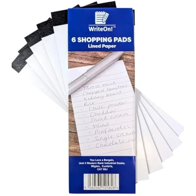 π COMPACT & SLIM DESIGN β These 6 slimline shopping list pads measure 75 x 210mm, making them perfectly portable for handbags, pockets, and kitchen counters.m π 30 SHEETS PER PAD β Each pad contains 30 lined sheets, ensuring ample space for shopping lists, reminders, and to-do lists. π HIGH-QUALITY 60 GSM PAPER β Enjoy smooth writing on durable, lightweight paper thatβs easy to tear off. π TOP-BOUND FOR CONVENIENCE β Flip pages effortlessly while shopping or organising your daily tasks. β MULTI-PURPOSE USE β Great for meal planning, grocery lists, office notes, reminders, and more. A must-have for homes, offices, and businesses.