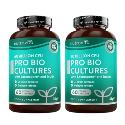 60 Billion CFU from 21-Strain Complex: Our vegan, easy to swallow and stable capsules contain 21 live bacteria strains with an impressive 60 billion CFU per serving (2 capsules). Each bottle contains 60 capsules which is a full month’s supply. With this pack of 2 bottles you will get a full 2 months supply. We have also included Lactospore (Bacillus coagulans), a live bacteria strain which has been subject to several clinical trials to support its effectiveness. Delayed release for better absorption: Most other similar products on the market are not delayed release as their capsules dissolve in the stomach acid. Our Bio Complex 60 billion CFU capsules are resistant to stomach acid allowing them to travel to the intestine where the live bacteria can be the most effective. In addition, every capsule contains 100mg of Inulin which promotes the growth of the friendly bacteria. Designed for daily use, it supports those looking for probiotics for women, pro biotics capsules. Manufactured in the UK and presented in an easy-to-swallow vegan format. Clean Nutrition You Can Trust: Nutravita’s supplements are manufactured in certified facilities to meet the highest GMP and BRC quality standards. Each batch is rigorously tested for quality and safety. Free from artificial colours, preservatives, and unnecessary binders or fillers for daily use. Formulated by Nutritionists: Nutravita's products are developed with a team of in-house nutritionists to deliver trusted, effective formulations. We include ingredients with proven benefits to support your wellbeing every day. We are here for your daily support for a wide range of health goals. Nutravita - Your Health Matters. Trusted By Many, Made For You: Founded in the UK, Nutravita is a family-run brand trusted by thousands of customers since 2014. Our mission is simple: to provide quality, honest supplements that support a healthier lifestyle - backed by transparency, science and care.
