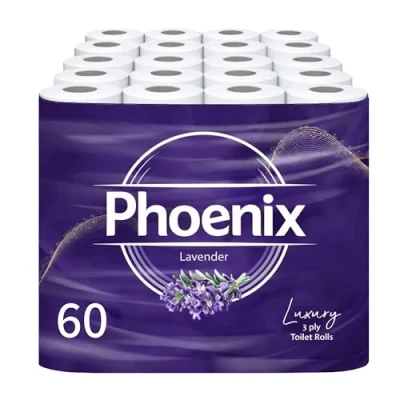 BULK BUY: Phoenix toilet roll 60 pack is the perfect bathroom tissue bulk buy for busy households. Designed to meet your family's everyday needs, these bulk toilet rolls 3 ply offer premium softness, strength and great value in every roll. SUSTAINABILITY: Eco friendly materials- Our 3 ply toilet tissues and inner cardboard rolls are fully recyclable and biodegradable, the plastic packaging is made from 30% recycled materials, making Phoenix a responsible choice for eco-conscious households. SOOTHING SCENT: Phoenix lavender toilet paper features a subtly infused core that releases a gentle lavender aroma, bringing a calming touch to every bathroom visit. QUILTED LUXURY: Phoenix 3 ply toilet rolls are made with three layers of ultra soft white tissue, offering enhanced thickness & durability, strong and absorbent for every day comfort you can count on. LOCALLY MADE, LOWER IMPACT: Proudfully manufactured in the UK reducing transport carbon emissions and supporting local jobs and communities.