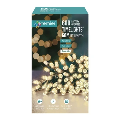 600 LED 60m Premier Christmas Indoor Outdoor Multi Function Battery Operated String Lights with Timer in Warm White. Brighten up your home this Christmas with these battery operated multi function string lights by Premier Decorations. LEDs are spaced approximately 10cm apart on a green cable, meaning that they can easily blend into most Christmas scenes. This set requires 3x 'C' batteries (not supplied) and has a 30cm lead from the weatherproof battery box to the first bulb. Function changing button is located on the battery box (static, combination, in waves, sequential, slow glow, chasing/flash, slow fade and twinkle/flash). Featuring a memory chip so that the previous setting is remembered, and 6 hour on / 18 hour off timer function that will help to preserve the life of your batteries. Suitable for both indoor and outdoor use, with an IP44 rating meaning that this set is not waterproof, but can withstand light splashes. Not just for Christmas, this set can be used at any point of the year and in a variety of ways, ideal for providing ambient lighting and creating eye catching scenes