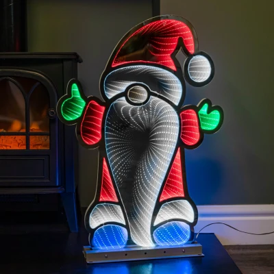 Transform your holiday decor with this stunning Santa infinity led light decoration. Infinity lights are a modern mirror effect using light to create an illusion of depth and a repeating light pattern. This simple yet mesmerising light up display is thin whilst creating this amazing 3D effect as you view Santa from different angles. Create a festive display and a talking point for all your family and guests. Suitable to be placed on most flat surfaces such as a mantle piece, windowsill or by the front door to welcome visitors this year. Featuring an infinity mirror with multi-coloured LEDs, this creates the never ending reflection of Santa when lit up. The decoration sits on metal base and is mains powered with a generous 3 meter clear cable. Quick and easy to set up, just simply peel the film off the mirror then attach the base and plug in. Suitable for indoor use and sheltered outdoor use (transformer plug must remain indoors). Product Dimensions Height: 60cm Length 43cm Stand 30cm x 7cm Cable Length 3m
