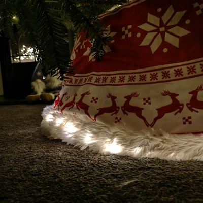 General description This 60cm LED Snowflake & Reindeer Christmas Tree Collar in Red and White features a stunning design adorned with reindeers and snowflakes. It is designed to fit around the base of your Christmas tree, effectively covering the tree stand while adding a festive touch. Technical specifications Dimensions: 60 cm Color: Red and White Lighting: Warm White LEDs Power: Black USB cable Installation Fits around the bottom of the Christmas tree Fastens together with a Velcro strip Usage This Christmas tree collar enhances the holiday atmosphere by providing a warm glow from the LED lights, making it a perfect addition to your festive decorations.