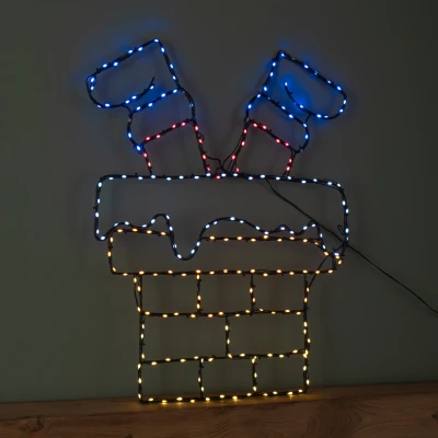 Add playful charm and vibrant colour to your seasonal decor with this 60cm Light up FlexiBrights Santa Down a Chimney LED silhouette. Designed to bring a touch of festive humour and vibrant colour to your Christmas display, this decoration captures the magical moment when Santa squeezes down the chimney with his boots in the air!. Measuring 60cm high and 45cm wide, this playful silhouette is illuminated by 223 multi-coloured twinkling LEDs, creating a dynamic and joyful lighting effect that draws attention day or night. The LEDs are intricately woven around a durable black metal frame. Mains powered with a 5 metre lead cable, giving you plenty of flexibility to place it where it shines brightest.. Suitable for indoor and outdoor use.. Product Specifications. 223 Multi-Coloured Twinkling LEDs. Height: 60cm Width: 45cm. Mains Powered with 5m Power Cable