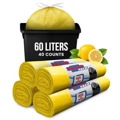 Fresh Lemon Scent for Cleaner Bins - Enjoy a refreshing lemon scent that helps minimise odours in kitchen bin bags, bathroom bin bags, and everyday waste. Ideal for households wanting bin liners that keep rubbish fresher while still strong enough for daily use. Strong 60L Bags with Secure Drawstring - Each bag includes a reinforced drawstring bag closure for quick tying, lifting, and carrying. Designed to be durable 60L bin liners, perfect for food waste, light rubbish, and general home or office waste bags. Fits Most Small Bins (60 Litres) - These versatile bin liners 60 litres fit pedal bins, swing bins, and small kitchen or bathroom bins. Great for apartments, offices, bedrooms, and utility rooms needing reliable bin bags without leaks. Reliable Everyday Bin Bags for Regular Waste - Designed for light to moderate household waste, these 60L bin liners are suitable for daily rubbish, food scraps, and bathroom or kitchen bins. A practical choice for customers who want simple, easy-to-use bags for routine disposal. Great Value – 4 Rolls, 60L Strong Bin Bags - Includes 4 rolls of 60L bin bags (10 bags per roll). A practical supply of small bin liners, perfect for dustbin bags, household waste, and routine clean-ups. Suitable for kitchens, bathrooms, and general rubbish bags use.