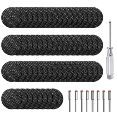 METAL CUTTING WHEEL: As an indispensable part of rotary tool accessories, these cut-off wheels are doing excellent job in cutting, grinding or slotting metals like screw, bolts, welds, sheets, etc. WEAR-RESISTANT: These cutting wheels are reinforced witn double-sided strengthening process, sturdy and durable, and would NOT easily chip or shatter. GREAT EFFICIENCY: Made of premium abrasives, these cutting discs can quickly cut or grind hard objects. Ideal replacements or spares for your rotary tool kit. PACKAGE CONTENTS: 60 pcs cutting discs (1-1/4'' / 32mm in diameter) and 8 pcs mandrels (1/8'' / 3mm in diameter) . Compatible with mainstream rotary tools of name brands. WARM NOTE: As the rotary tool metal cutting disc wheel will break under a extreme pressure, for your safety, please must wear gloves and goggles when using the cutting wheel.