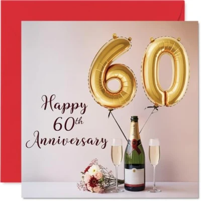 60th Anniversary Card for Women Men Balloons & Bottle of Bubbly Happy 60 Year Companion Wife Partner Husband, 145mm Wedding Anniversaries Greeting Cards