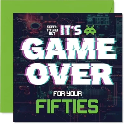 MAKE THEM SMILE WITH THIS UNIQUE BIRTHDAY CARD: This exceptional quality birthday card for him or her shows the design 'Sorry to say but its game over for your Fifties'. If you are looking for special birthday greetings cards for Men birthday card then then this happy birthday card is bound to make them smile. Not just for birthday gifts for Men this could also be for Friend, Grandad, Grandma, Neighbour, Uncle, Wife, Sister or Husband. WHAT DO YOU GET: The cards are printed on both sides with the inside print saying 'Welcome to the next level' and ample space for your own personal message. The unique fun design is printed on a specially sourced and environmentally responsible board. At 360 microns thick the natural white one-sided gloss board has a quality look and feel. Supplied with a coloured gummed envelope to complement the design and ready to be sealed and sent in the post. NO INK SMUDGES: There is nothing worse than writing inside a card to find that the shiny surface makes the ink smudge. This is why we use a high quality one sided coated board. The uncoated side will absorb more of the ink from your pen to make smudging a thing of the past. 60th Birthday card for Grandma, 60th Birthday card for Neighbour, 60th Birthday card for Uncle. SIZES: Greeting Card = 145mm x 145mm, Envelope = 155mm x 155mm, Card Thickness = 360 micron. Wife 60th birthday card, birthday cards for Sister, special birthday cards for Husband, 60th birthday card Friend, Grandad 60th birthday card. MADE AND QUALITY CHECKED IN THE UK: We print and manufacture all our products right here in the UK so you can be sure of a fast turnaround and a product that is expertly made. Using environmentally responsible premium board our card is conscious of the responsible management of the world's forests - perfect birthday cards for Men, fun birthday cards for him, Grandad 60th birthday cards, female birthday cards.