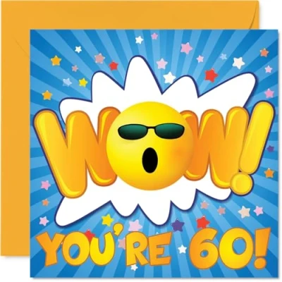 MAKE THEM SMILE WITH THIS UNIQUE BIRTHDAY CARD: This exceptional quality birthday card for him or her shows the design 'WOW Youre 60'. If you are looking for special birthday greetings cards for Men birthday card then then this happy birthday card is bound to make them smile. Not just for birthday gifts for Men this could also be for Grandad, Neighbour, Auntie, Friend, Uncle, Grandma, Cousin or Nanny. WHAT DO YOU GET: The cards are printed on both sides with the inside print saying '0' and ample space for your own personal message. The unique fun design is printed on a specially sourced and environmentally responsible board. At 360 microns thick the natural white one-sided gloss board has a quality look and feel. Supplied with a coloured gummed envelope to complement the design and ready to be sealed and sent in the post. NO INK SMUDGES: There is nothing worse than writing inside a card to find that the shiny surface makes the ink smudge. This is why we use a high quality one sided coated board. The uncoated side will absorb more of the ink from your pen to make smudging a thing of the past. 60th Birthday card for Auntie, 60th Birthday card for Friend, 60th Birthday card for Uncle. SIZES: Greeting Card = 145mm x 145mm, Envelope = 155mm x 155mm, Card Thickness = 360 micron. Grandma 60th birthday card, birthday cards for Cousin, special birthday cards for Nanny, 60th birthday card Grandad, Neighbour 60th birthday card. MADE AND QUALITY CHECKED IN THE UK: We print and manufacture all our products right here in the UK so you can be sure of a fast turnaround and a product that is expertly made. Using environmentally responsible premium board our card is conscious of the responsible management of the world's forests - perfect birthday cards for Men, fun birthday cards for him, Neighbour 60th birthday cards, female birthday cards.