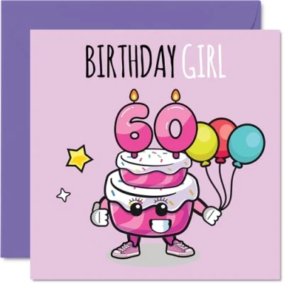MAKE HER SMILE WITH THIS UNIQUE BIRTHDAY CARD: This exceptional quality birthday card for her shows the design 'Birthday Girl 60'. If you are looking for special birthday greetings cards for Women birthday card then then this happy birthday card is bound to make her smile. Not just for birthday gifts for Women this could also be for Nanny, Nan, Friend, Wife, Auntie, Sister, Neighbour or Cousin. WHAT DO YOU GET: The card is printed on one side and BLANK ON THE INSIDE to allow you to write your very own message. The unique fun design is printed on a specially sourced and environmentally responsible board. At 360 microns thick the natural white one-sided gloss board has a quality look and feel. Supplied with a coloured gummed envelope to complement the design and ready to be sealed and sent in the post. Great Nanny birthday cards, 60th birthday card, Nan birthday card. NO INK SMUDGES: There is nothing worse than writing inside a card to find that the shiny surface makes the ink smudge. This is why we use a high quality one sided coated board. The uncoated side will absorb more of the ink from your pen to make smudging a thing of the past. 60th Birthday card for Friend, 60th Birthday card for Wife, 60th Birthday card for Auntie. SIZES: Greeting Card = 145mm x 145mm, Envelope = 155mm x 155mm, Card Thickness = 360 micron. Sister 60th birthday card, birthday cards for Neighbour, cute birthday cards for Cousin, 60th birthday card Nanny, Nan 60th birthday card. MADE AND QUALITY CHECKED IN THE UK: We print and manufacture all our products right here in the UK so you can be sure of a fast turnaround and a product that is expertly made. Using environmentally responsible premium board our card is conscious of the responsible management of the world's forests - perfect birthday cards for Women, fun birthday cards for her, Nan 60th birthday cards, female birthday cards.