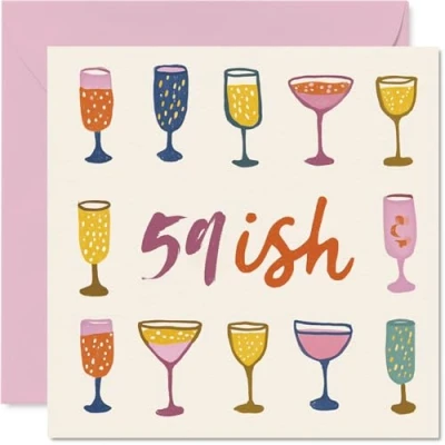 MAKE THEM SMILE WITH THIS UNIQUE BIRTHDAY CARD: This exceptional quality birthday card for him or her shows the design '59 Ish'. If you are looking for special birthday greetings cards for Men birthday card then then this happy birthday card is bound to make them smile. Not just for birthday gifts for Men this could also be for Nan, Uncle, Dad, Grandma, Nanny, Cousin, Auntie or Wife. WHAT DO YOU GET: The cards are printed on both sides with the inside print saying 'Have a Wonderful Day' and ample space for your own personal message. The unique fun design is printed on a specially sourced and environmentally responsible board. At 360 microns thick the natural white one-sided gloss board has a quality look and feel. Supplied with a coloured gummed envelope to complement the design and ready to be sealed and sent in the post. NO INK SMUDGES: There is nothing worse than writing inside a card to find that the shiny surface makes the ink smudge. This is why we use a high quality one sided coated board. The uncoated side will absorb more of the ink from your pen to make smudging a thing of the past. 60th Birthday card for Dad, 60th Birthday card for Grandma, 60th Birthday card for Nanny. SIZES: Greeting Card = 145mm x 145mm, Envelope = 155mm x 155mm, Card Thickness = 360 micron. Cousin 60th birthday card, birthday cards for Auntie, special birthday cards for Wife, 60th birthday card Nan, Uncle 60th birthday card. MADE AND QUALITY CHECKED IN THE UK: We print and manufacture all our products right here in the UK so you can be sure of a fast turnaround and a product that is expertly made. Using environmentally responsible premium board our card is conscious of the responsible management of the world's forests - perfect birthday cards for Men, fun birthday cards for him, Uncle 60th birthday cards, female birthday cards.