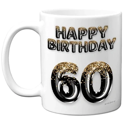 MAKE THEM SMILE ON HIS SPECIAL DAY: This exceptional quality birthday gift for her or him shows the design 'Happy Birthday 60'. If you are looking for funny birthday mugs for women, then then this happy birthday mug is bound to make them laugh. Not just for friendship gifts for women this could also be for Best Friend, Work Colleague, Mum, Grandma, Nan, Dad, Grandad, Nanny, Colleague, Brother, Sister, Cousin, Auntie or Uncle. WHAT DO YOU GET: This novelty mug for him or her is made from the highest quality mugs available on the market. An 11oz ceramic gloss finished mug with a large handle for ease of use. The cheeky design is printed on both sides so no one will miss it. Incredibly funny and thoughtful gifts for women and men from Stuff4 Ltd. PACKED FOR PROTECTION: Every order is packed in a drop proof double walled cardboard Mug Mailer which are lightweight and strong enough to provide total protection. So have the birthday boy in pieces and not the rude mugs, Dad birthday gifts, Uncle birthday gifts, Grandad birthday gifts. MADE AND QUALITY CHECKED IN THE UK: We manufacture all our product right her in the UK so you can be sure of a fast turnaround and a product that is expertly made - for his birthday gifts. 11oz DISHWASHER AND MICROWAVE SAFE MUGS: Made from premium ceramic our 11oz heavyweight mugs are manufactured with a dishwasher safe premium coating. This means that the colours of your image will not fade from even after multiple cycles (up to 800) through a dishwasher. They are also microwave safe.