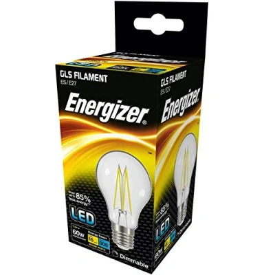 General description These Dimmable, Clear Finish Energizer® LED GLS Bulbs feature a decorative filament design, making them ideal for decorative fixtures. They replicate the appearance and light output of traditional halogen bulbs while providing significant energy savings of 85% compared to their halogen equivalents. The bulbs offer instant, flicker-free light and have an impressive average rated life of approximately 15,000 hours. Technical specifications Fitting: ES (E27) Input Wattage: 7.2W (60W equivalent) Lumens of Light: 806 lm Switching Cycles: 40,000 Average Rated Life: 15,000 hours Colour Temperature: 2,700K (Warm White) Lamp Dimensions: 60 x 109 mm Dimmable: Yes Rated: A+ Compatibility and accessories Compatible with standard E27 sockets. Installation Simply screw the bulb into a compatible E27 socket for immediate use. Usage Ideal for decorative lighting in homes, restaurants, or retail spaces where a warm white glow is desired.