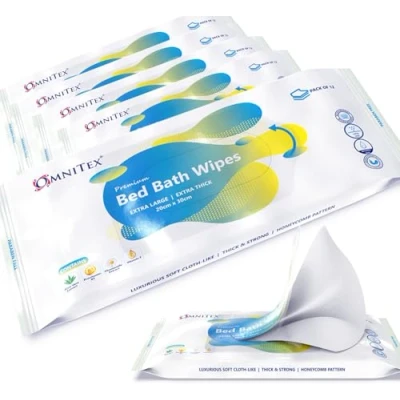 Omnitex Premium Bed Bath Wipes, Microveable, Extra Thick & Extra Large for a soft luxurious experience. Honeycomb Texture on Wipes facilitates better cleaning coverage, absorbency and hygiene Ideal wipe Size to use one wipe for each area of the body : Face, Neck, Chest, Arms, Perineum, Legs, Back & Buttocks. Four Extra Wipes in each pack if additional cleaning required Added Herbal extracts & Vitamins cleanses, nourishes & protects. Lightly fragranced, medical grade premium fabric and generous amounts of cleaning solution provides the user a safe and enhanced cleansing. Dermatologically Tested. Latex Free, Alcohol Free, Parabens Free. ISO9001 registered supplier 5 packs of 12. Total 60 wipes