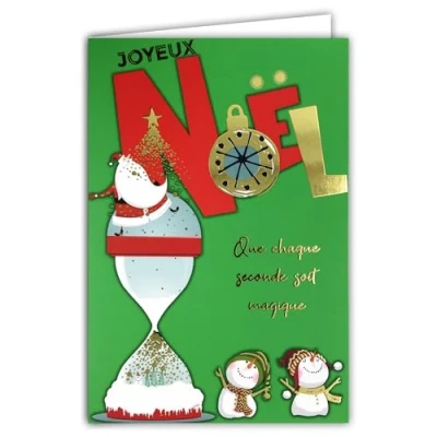 61 5838 Merry Christmas Instant Magic Card Glossy Gold and White Envelope Size 12 x 17.5 cm Santa Snowman Snowball Hourglass Star Rain Made in France