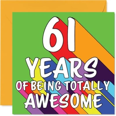 MAKE THEM SMILE WITH THIS UNIQUE BIRTHDAY CARD: This exceptional quality birthday card for him or her shows the design '61 YEARS OF BEING TOTALLY AWESOME'. If you are looking for special birthday greetings cards for Men birthday card then then this happy birthday card is bound to make them smile. Not just for birthday gifts for Men this could also be for Neighbour, Auntie, Friend, Uncle, Grandma, Cousin, Nanny or Sister. WHAT DO YOU GET: The card is printed on one side and BLANK ON THE INSIDE to allow you to write your very own message. The unique fun design is printed on a specially sourced and environmentally responsible board. At 360 microns thick the natural white one-sided gloss board has a quality look and feel. Supplied with a coloured gummed envelope to complement the design and ready to be sealed and sent in the post. Great Neighbour birthday cards, Auntie birthday card. DESIGNED FOR WRITING: There is nothing worse than writing inside a card to find that the shiny surface makes the ink smudge. This is why we use a high quality one sided coated board. The uncoated side will absorb more of the ink from your pen to make smudging a thing of the past. 61st Birthday card for Friend, 61st Birthday card for Uncle, 61st Birthday card for Grandma. SIZES: Greeting Card = 145mm x 145mm, Envelope = 155mm x 155mm, Card Thickness = 360 micron. Cousin 61st birthday card, birthday cards for Nanny, special birthday cards for Sister, 61st birthday card Neighbour, Auntie 61st birthday card. MADE AND QUALITY CHECKED IN THE UK: We print and manufacture all our products right here in the UK so you can be sure of a fast turnaround and a product that is expertly made. Using environmentally responsible premium board our card is conscious of the responsible management of the world's forests - perfect birthday cards for Men, fun birthday cards for him, Auntie 61st birthday cards, female birthday cards.
