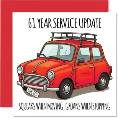 MAKE THEM SMILE WITH THIS UNIQUE BIRTHDAY CARD: This exceptional quality birthday card for him or her shows the design '61 Year Service Update, Squeaks When Moving, Groans When Stopping'. If you are looking for special birthday greetings cards for Men birthday card then then this happy birthday card is bound to make them smile. Not just for birthday gifts for Men this could also be for Auntie, Grandad, Grandma, Uncle, Friend, Wife, Dad or Cousin. WHAT DO YOU GET: The cards are printed on both sides with the inside print saying '0' and ample space for your own personal message. The unique fun design is printed on a specially sourced and environmentally responsible board. At 360 microns thick the natural white one-sided gloss board has a quality look and feel. Supplied with a coloured gummed envelope to complement the design and ready to be sealed and sent in the post. NO INK SMUDGES: There is nothing worse than writing inside a card to find that the shiny surface makes the ink smudge. This is why we use a high quality one sided coated board. The uncoated side will absorb more of the ink from your pen to make smudging a thing of the past. 61st Birthday card for Grandma, 61st Birthday card for Uncle, 61st Birthday card for Friend. SIZES: Greeting Card = 145mm x 145mm, Envelope = 155mm x 155mm, Card Thickness = 360 micron. Wife 61st birthday card, birthday cards for Dad, special birthday cards for Cousin, 61st birthday card Auntie, Grandad 61st birthday card. MADE AND QUALITY CHECKED IN THE UK: We print and manufacture all our products right here in the UK so you can be sure of a fast turnaround and a product that is expertly made. Using environmentally responsible premium board our card is conscious of the responsible management of the world's forests - perfect birthday cards for Men, fun birthday cards for him, Grandad 61st birthday cards, female birthday cards.