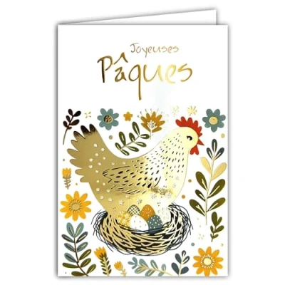 62 1028 Happy Easter Card in Shiny Gold with Envelope 12 x 17.5 cm Illustration Hen Incuves Painted Eggs Nest Flowers Party Spring Creation Edition Print Made France