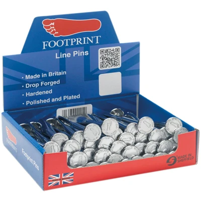 General description Steel line pins, drop forged, measuring 160mm (6 1/4 in) long, hardened and chrome plated, are ideal for various applications in DIY and home improvement projects. This product comes in a convenient display box containing 50 pins. Technical specifications Length: 160mm (6 1/4 in) Material: Steel Finish: Hardened and chrome plated Quantity: 50 pins per display box
