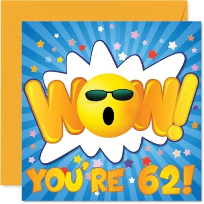 MAKE THEM SMILE WITH THIS UNIQUE BIRTHDAY CARD: This exceptional quality birthday card for him or her shows the design 'WOW Youre 62'. If you are looking for special birthday greetings cards for Men birthday card then then this happy birthday card is bound to make them smile. Not just for birthday gifts for Men this could also be for Auntie, Friend, Uncle, Grandma, Cousin, Nanny, Sister or Brother. WHAT DO YOU GET: The cards are printed on both sides with the inside print saying '0' and ample space for your own personal message. The unique fun design is printed on a specially sourced and environmentally responsible board. At 360 microns thick the natural white one-sided gloss board has a quality look and feel. Supplied with a coloured gummed envelope to complement the design and ready to be sealed and sent in the post. NO INK SMUDGES: There is nothing worse than writing inside a card to find that the shiny surface makes the ink smudge. This is why we use a high quality one sided coated board. The uncoated side will absorb more of the ink from your pen to make smudging a thing of the past. 62nd Birthday card for Uncle, 62nd Birthday card for Grandma, 62nd Birthday card for Cousin. SIZES: Greeting Card = 145mm x 145mm, Envelope = 155mm x 155mm, Card Thickness = 360 micron. Nanny 62nd birthday card, birthday cards for Sister, special birthday cards for Brother, 62nd birthday card Auntie, Friend 62nd birthday card. MADE AND QUALITY CHECKED IN THE UK: We print and manufacture all our products right here in the UK so you can be sure of a fast turnaround and a product that is expertly made. Using environmentally responsible premium board our card is conscious of the responsible management of the world's forests - perfect birthday cards for Men, fun birthday cards for him, Friend 62nd birthday cards, female birthday cards.