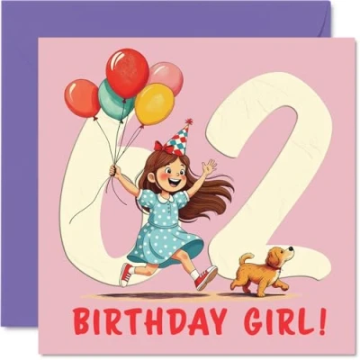 62nd Birthday Cards for Women Balloon Girl Happy Card 62 Year Old Woman Nan Cousin Grandma Neighbour, 145mm Bday Greeting