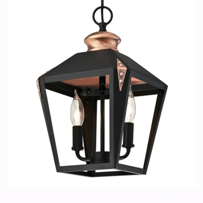 AmazonTwo-light indoor traditional lantern style pendant with matte black and copper accents adds old-world charm to any room May be installed on sloped ceilings, includes instructions and mounting hardware for easy installation Height-38 cm, Diameter-23 cm, maximum cord length-152 cm, maximum chain length-91 cm Uses two E14 base light bulbs, 40-watt maximum (not included) Five-year limited warranty against defects in materials and workmanship, CE Certified Bulb not included