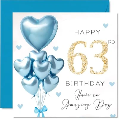 63rd Birthday Cards for Men Blue Glitter Balloons Happy Card 63 Year Old Man Uncle Friend Cousin Neighbour, 145mm Bday Greeting
