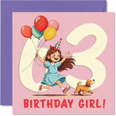 63rd Birthday Cards for Women Balloon Girl Happy Card 63 Year Old Woman Cousin Wife Nan Grandma, 145mm Bday Greeting