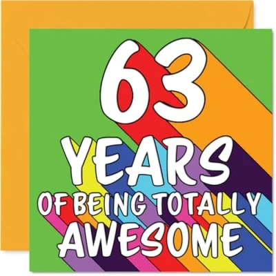MAKE THEM SMILE WITH THIS UNIQUE BIRTHDAY CARD: This exceptional quality birthday card for him or her shows the design '63 YEARS OF BEING TOTALLY AWESOME'. If you are looking for special birthday greetings cards for Men birthday card then then this happy birthday card is bound to make them smile. Not just for birthday gifts for Men this could also be for Friend, Uncle, Grandma, Cousin, Nanny, Sister, Brother or Wife. WHAT DO YOU GET: The card is printed on one side and BLANK ON THE INSIDE to allow you to write your very own message. The unique fun design is printed on a specially sourced and environmentally responsible board. At 360 microns thick the natural white one-sided gloss board has a quality look and feel. Supplied with a coloured gummed envelope to complement the design and ready to be sealed and sent in the post. Great Friend birthday cards, Uncle birthday card. DESIGNED FOR WRITING: There is nothing worse than writing inside a card to find that the shiny surface makes the ink smudge. This is why we use a high quality one sided coated board. The uncoated side will absorb more of the ink from your pen to make smudging a thing of the past. 63rd Birthday card for Grandma, 63rd Birthday card for Cousin, 63rd Birthday card for Nanny. SIZES: Greeting Card = 145mm x 145mm, Envelope = 155mm x 155mm, Card Thickness = 360 micron. Sister 63rd birthday card, birthday cards for Brother, special birthday cards for Wife, 63rd birthday card Friend, Uncle 63rd birthday card. MADE AND QUALITY CHECKED IN THE UK: We print and manufacture all our products right here in the UK so you can be sure of a fast turnaround and a product that is expertly made. Using environmentally responsible premium board our card is conscious of the responsible management of the world's forests - perfect birthday cards for Men, fun birthday cards for him, Uncle 63rd birthday cards, female birthday cards.