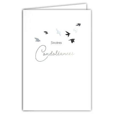 ELEGANT CONDOLEANCE CARD: Exquisite design with delicate illustration of birds in flight and doves symbolizing peace, accompanied by the words "Sincères Condolences" to express sympathies with respect and delicacy Made in France on high quality matte paper offering a pleasant surface to write your personal message of comfort and support inside Practical size: 12 x 17.5 cm, ideal size to convey your thoughts and accompany the bereaved during these difficult times SOOTHING ILLUSTRATION: Minimalist design in silver tones with flight of birds creating a serene and contemplative atmosphere, perfect for those sensitive circumstances COMPLETE AND READY TO SEND - Comes with a matching white envelope, lightweight and easy to post to send your sympathy with delicacy