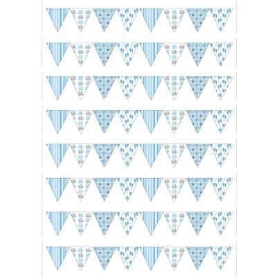 Baby Boy Shower Patterned Edible Icing Sheet Small Bunting Cake toppers You will receive bunting toppers as shown in the photo and they require cutting out with sharp scissors. The triangles (2.5cm tall) can then be arranged on your cake to form bunting Baby Boy pattern on each triangle which will make up the bunting to go around your cake Decor Sheet Ingredients - E1422,E1412,Maltodextrin,Humectant E422, Sugar, Water, Stabilizers E414,E460i, Dextrose, Emulsifiers E435, E491, E471, , Flavours, Acidity Regulator E3330, Preservative E202, Sucralose. Fully edible, printed with edible inks, Manufacturer: Top That