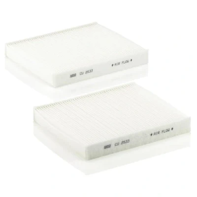 MANN-FILTER Cabin Air Filter CU 2533-2 (set of 2) / Dimensions (mm): A = 245; B = 206; H = 32 / Premium Filter in Original Equipment Quality High-quality MANN-FILTER cabin filters offer almost 100% protection against particles such as pollen, diesel soot and tyre abrasion - for a feel-good climate in the vehicle interior and protection of the air conditioning system Exact fit and perfect tightness ensure constant filtration performance during the entire service interval / Optimum vehicle interior ventilation due to the high air flow capacity Looking to find the correct filter? Select: brand, model, vehicle type, and engine type above to see which one fits your vehicle MANN+HUMMEL complies with REACH-regulation + supports the goal of Improved health and safety through the design, manufacturing, usage, disposal and recycling of our products