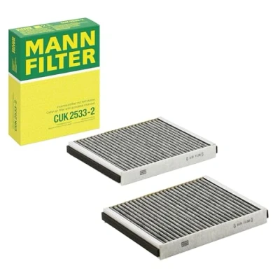 MANN-FILTER Cabin Air Filter CUK 2533-2 (set of 2) / Dimensions (mm): A = 245; B = 206; H = 32 / Premium Filter in Original Equipment Quality High-quality MANN-FILTER cabin filters with active carbon - nearly 100% protection from particles like pollen, diesel soot & tyre abrasion / Additional protection from harmful gases & unpleasant odour The trated highly-effective activated carbon gives protection against harmful gases such as ozone, nitrogen oxide or sulphur dioxide and eliminates unpleasant odours during the entire service interval Looking to find the correct filter? Select: brand, model, vehicle type, and engine type above to see which one fits your vehicle MANN+HUMMEL complies with REACH-regulation + supports the goal of Improved health and safety through the design, manufacturing, usage, disposal and recycling of our products