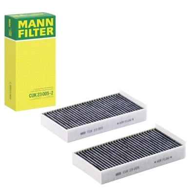 MANN-FILTER Cabin Air Filter CUK 23 005-2 (set of 2) / Dimensions (mm): A = 232; B = 116; H = 32 / Premium Filter in Original Equipment Quality High-quality MANN-FILTER cabin filters with active carbon - nearly 100% protection from particles like pollen, diesel soot & tyre abrasion / Additional protection from harmful gases & unpleasant odour The trated highly-effective activated carbon gives protection against harmful gases such as ozone, nitrogen oxide or sulphur dioxide and eliminates unpleasant odours during the entire service interval Looking to find the correct filter? Select: brand, model, vehicle type, and engine type above to see which one fits your vehicle MANN+HUMMEL complies with REACH-regulation + supports the goal of Improved health and safety through the design, manufacturing, usage, disposal and recycling of our products