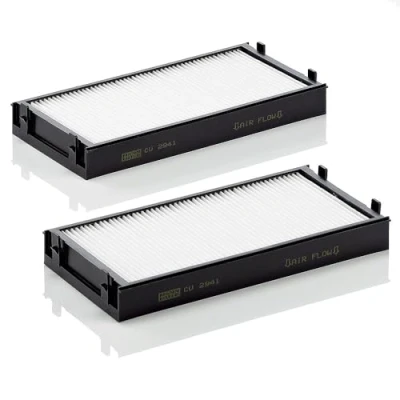 MANN-FILTER Cabin Air Filter CU 2941-2 (set of 2) / Dimensions (mm): A = 293; B = 138; H = 34 / Premium Filter in Original Equipment Quality High-quality MANN-FILTER cabin filters offer almost 100% protection against particles such as pollen, diesel soot and tyre abrasion - for a feel-good climate in the vehicle interior and protection of the air conditioning system Exact fit and perfect tightness ensure constant filtration performance during the entire service interval / Optimum vehicle interior ventilation due to the high air flow capacity Looking to find the correct filter? Select: brand, model, vehicle type, and engine type above to see which one fits your vehicle MANN+HUMMEL complies with REACH-regulation + supports the goal of Improved health and safety through the design, manufacturing, usage, disposal and recycling of our products