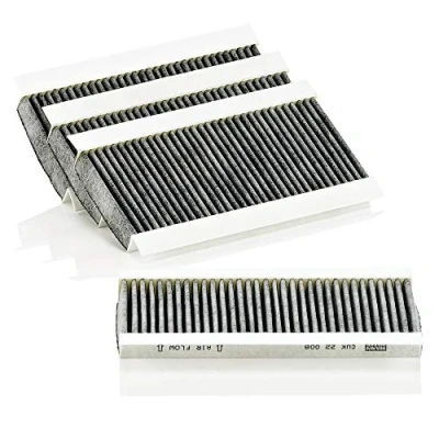 MANN-FILTER Cabin Air Filter CUK 22 008-4 (set of 4) / Dimensions (mm): A = 214; B = 93; H = 19 / Premium Filter in Original Equipment Quality High-quality MANN-FILTER cabin filters with active carbon - nearly 100% protection from particles like pollen, diesel soot & tyre abrasion / Additional protection from harmful gases & unpleasant odour The trated highly-effective activated carbon gives protection against harmful gases such as ozone, nitrogen oxide or sulphur dioxide and eliminates unpleasant odours during the entire service interval Looking to find the correct filter? Select: brand, model, vehicle type, and engine type above to see which one fits your vehicle MANN+HUMMEL complies with REACH-regulation + supports the goal of Improved health and safety through the design, manufacturing, usage, disposal and recycling of our products